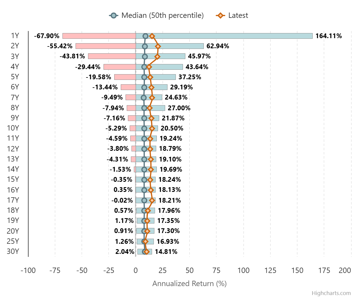 I grafici mostrano come cambiano i rendimenti in base al periodo di detenzione: Le candele mostrano le fluttuazini e evidenziano il 90% percentile dei risultati e la mediana. Inoltre in arancione viene mostrato l'andamento dell'ultimo portafoglio osservato (esempio quello degli ultimi 1, 2, ..., 30 anni).