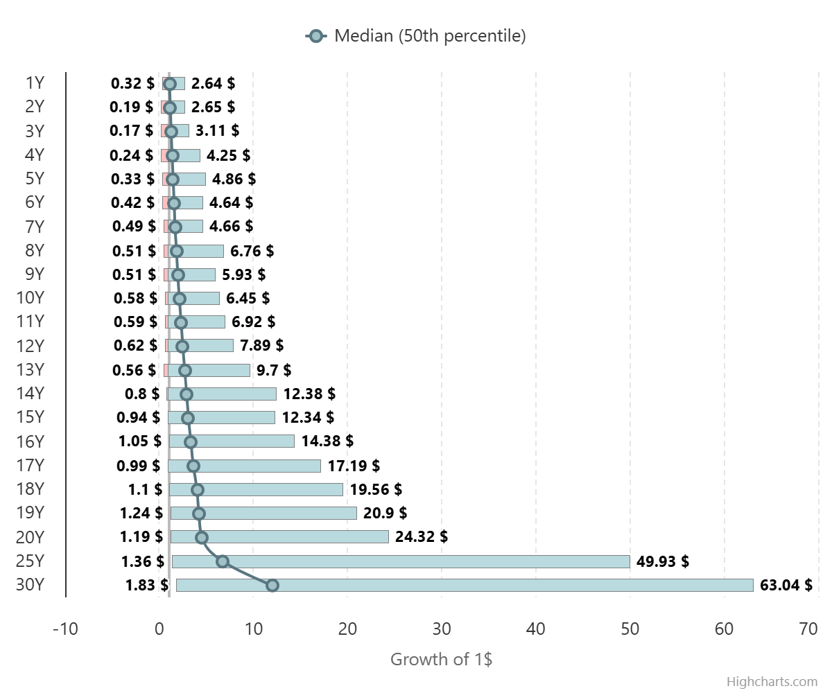 Nel grafico sotto è riportato il rendimento annualizzato, tipicamente chiamato CAGR in finanza (Compound Annual Growth Rate). Il rendimento è nominale, lordo ed include i dividendi. Per un investitore italiano, bisogna togliere la tassazione sui dividendi, la tassazione sulla plusvalenza ed inserire il cambio lira/dollaro prima ed EUR/dollaro poi.