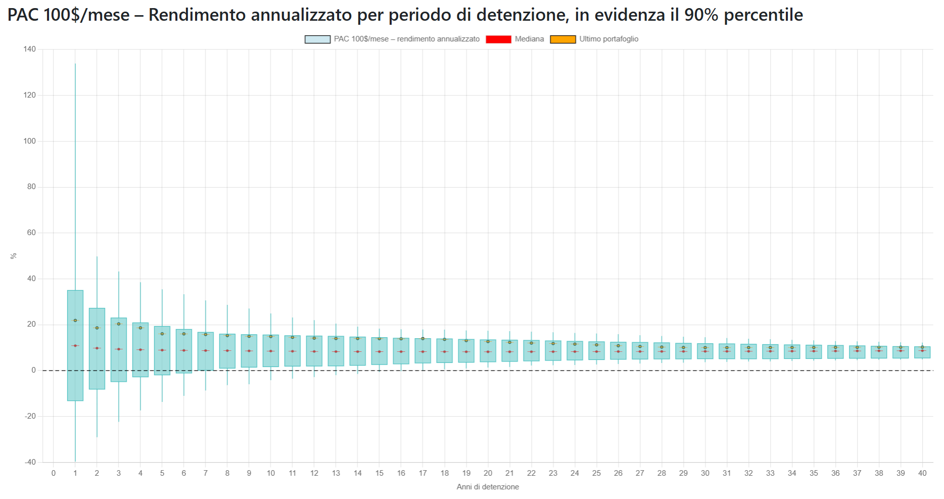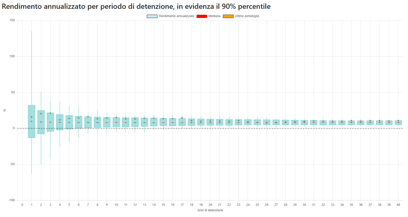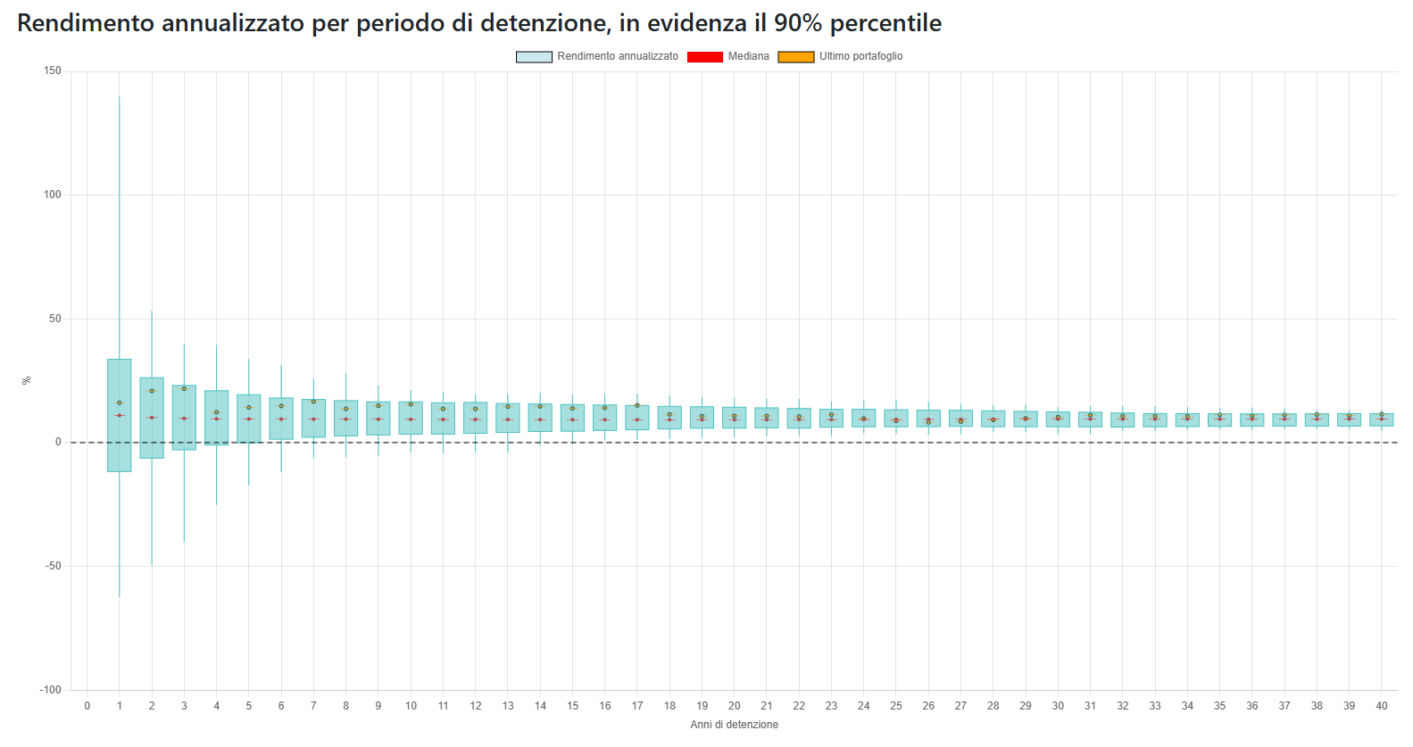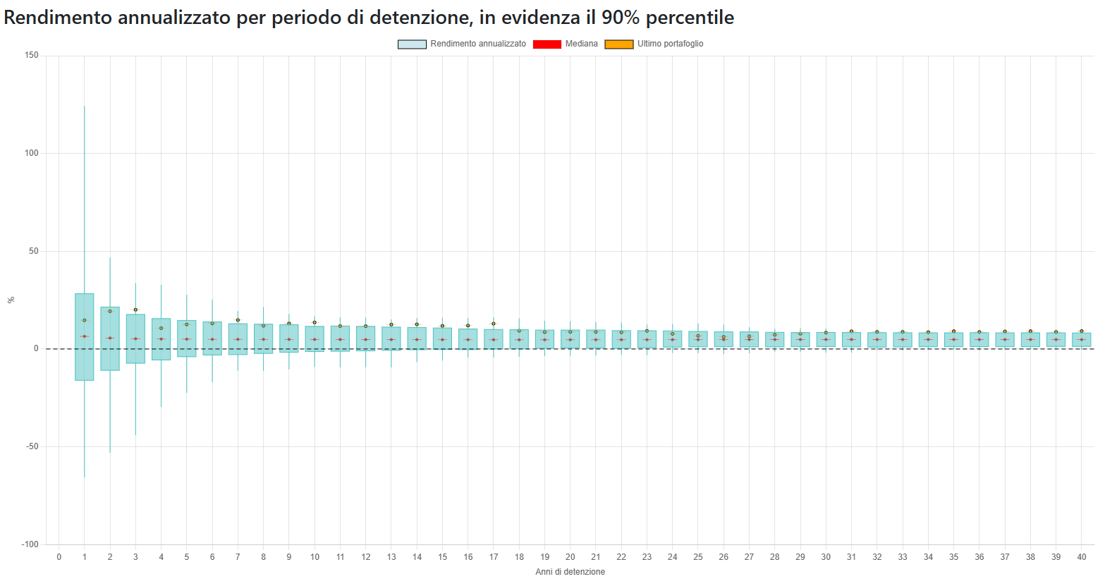 I grafici mostrano come cambiano i rendimenti in base al periodo di detenzione: Le candele mostrano le fluttuazini e evidenziano il 90% percentile dei risultati e la mediana. Inoltre in arancione viene mostrato l'andamento dell'ultimo portafoglio osservato (esempio quello degli ultimi 1, 2, ..., 30 anni).