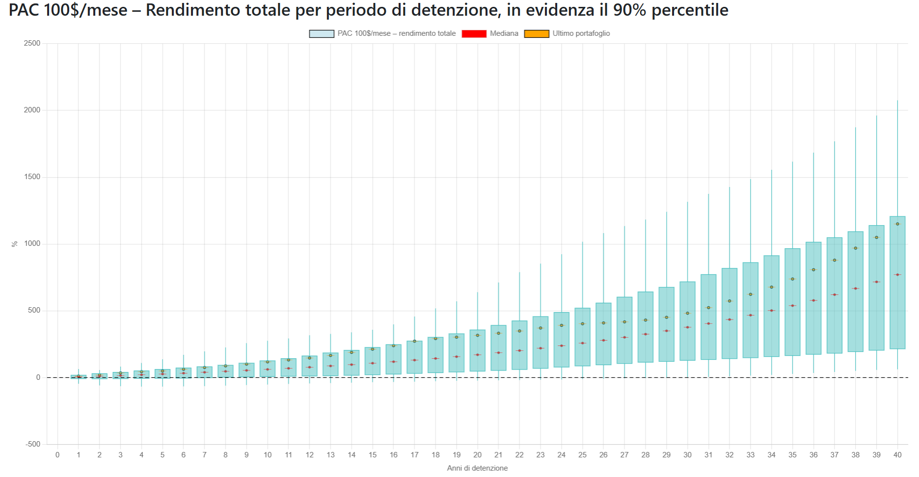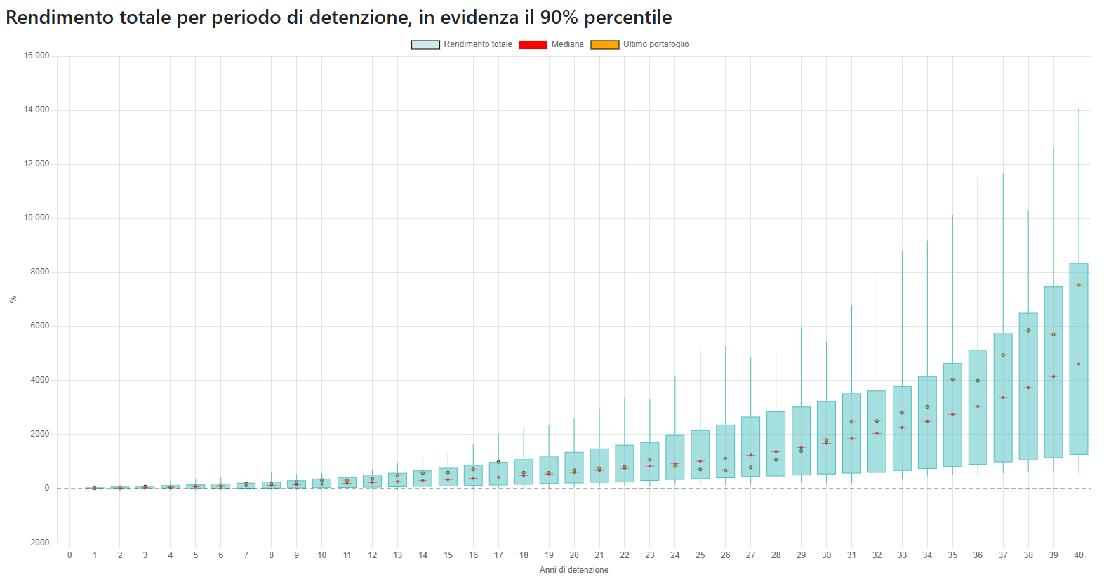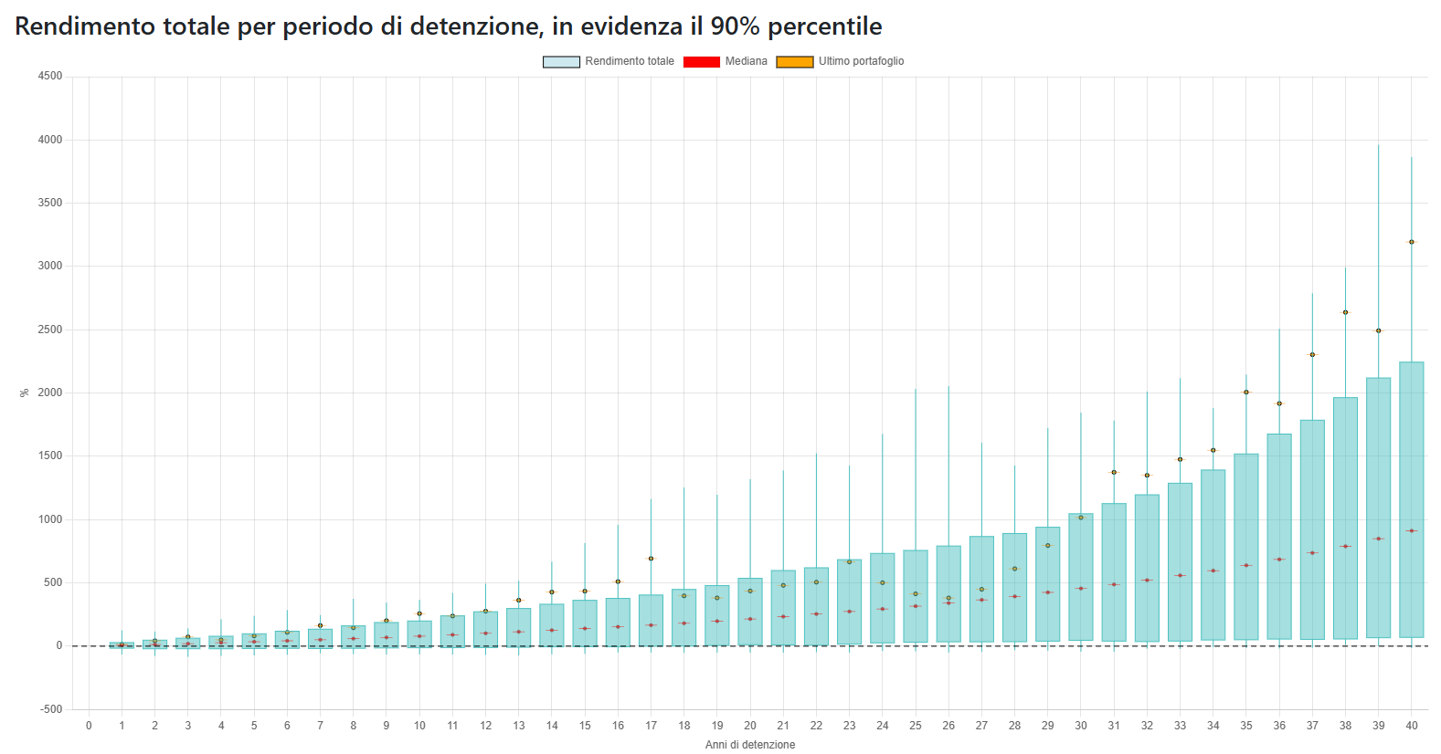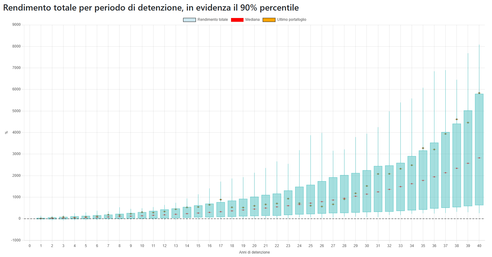 I grafici mostrano come cambiano i rendimenti in base al periodo di detenzione: Le candele mostrano le fluttuazini e evidenziano il 90% percentile dei risultati e la mediana. Inoltre in arancione viene mostrato l'andamento dell'ultimo portafoglio osservato (esempio quello degli ultimi 1, 2, ..., 30 anni).