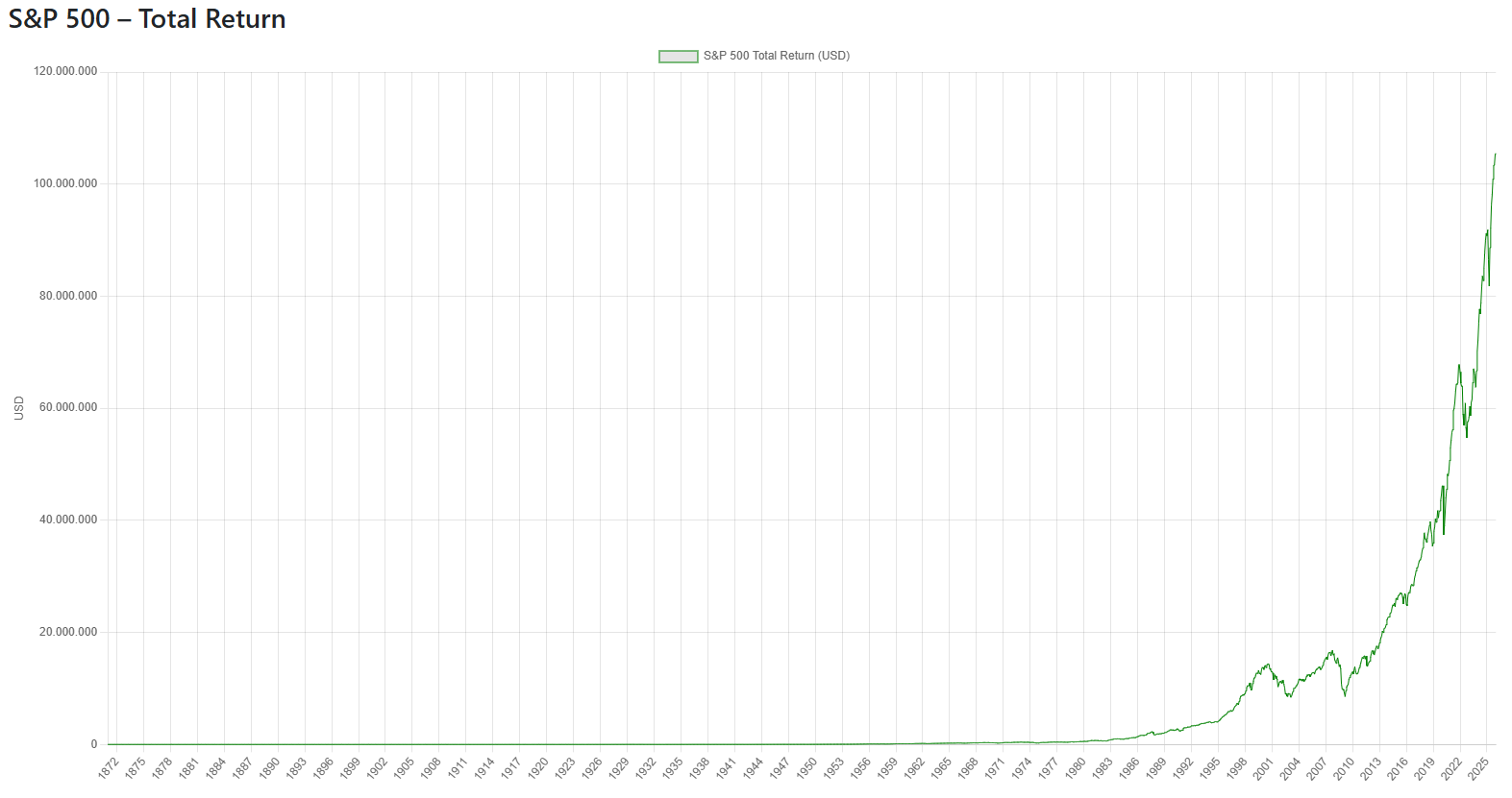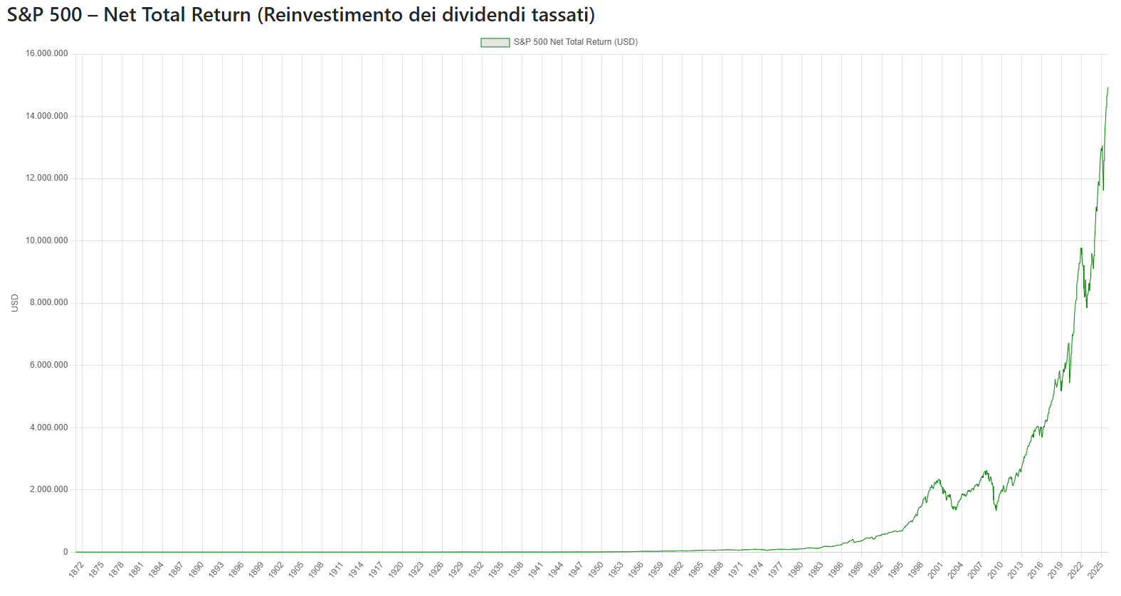 Questo gradiente è estremamente informativo dal punto di vista economico. Storicamente, soprattutto tra la fine del XIX secolo e la prima metà del XX secolo, una quota rilevante del rendimento azionario proveniva dai dividendi. In quel periodo i dividend yield erano strutturalmente elevati (spesso superiori al 4–5%) e il reinvestimento dei flussi rappresentava una componente fondamentale del rendimento totale di lungo periodo.